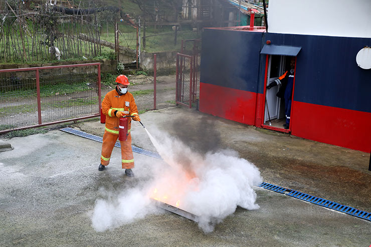 Baltaş, Derepazarı ilçesindeki Denizcilik Fakültesi alanında, midye kabuğundan üretilen yangın boğucu tozu, uygulamalı olarak gazetecilere tanıttı.