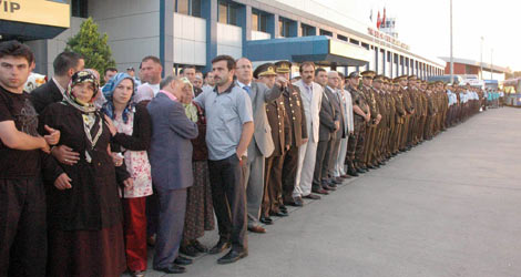 Şehit polis memurunun uçaktan alınan cenazesi ambulansa konulurken, yakınları ve meslektaşları gözyaşlarına boğuldu.