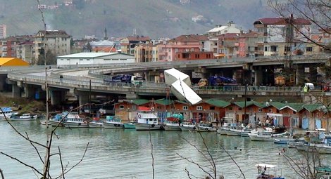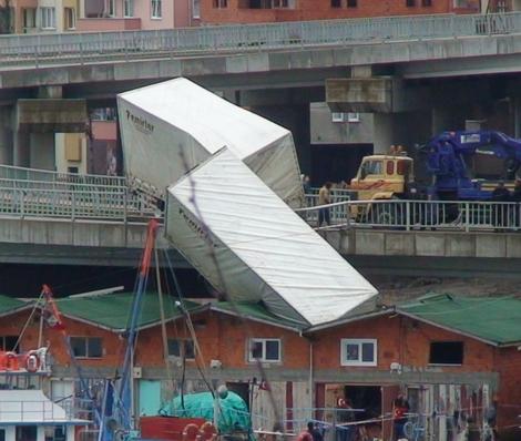 Ön kısmı köprünün altında bulunan balıkçı barınaklarının üzerine düşen TIR, dorsesi köprü demirlerine takılınca havada asılı kaldı. Kazada TIR'ın ön kısmının üzerine devrildiği Abdullah Eğrioğlu'na ait balıkçı barınağında büyük hasar meydana geldi.
