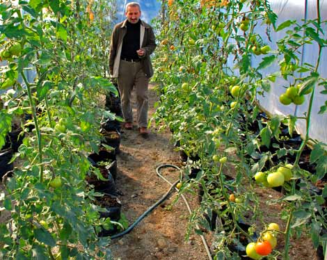 Toprak olmadan, kovalara doldurulmuş çay lifinde ekilen domates ve salatalar meyve verdi.