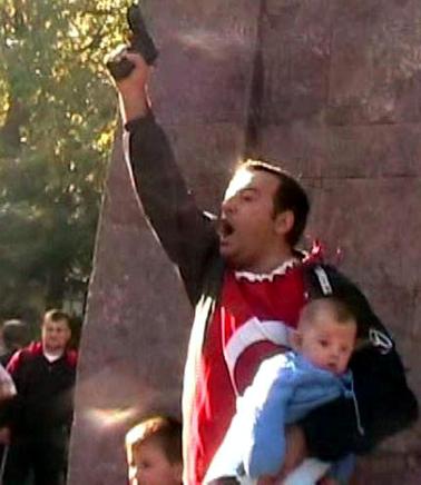 Bugün öğle saatlerinde boynunda Türk bayrağı, biri kucağında olmak üzere 2 çocuğu ile birlikte Meydan Parkı içindeki Atatürk Anıtı önüne gelen Murat Aksuoğlu (32), belindeki kuru sıkı silahını çıkararak bugün Hakkari'de yaşanan terör saldırılarını protesto etti. "Kanıma dokunuyor" diyerek gözyaşı döken Aksuoğlu'na vatandaşlar alkış ve sloganlarla destek verdi. Aksuoğlu'nun elindeki silahı almak isteyen polislerle kızgın vatandaş arasında zaman zaman tartışma yaşandı.
