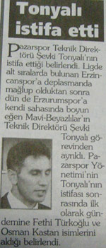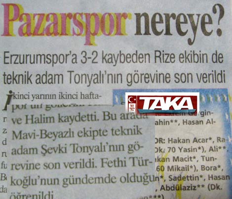 Trabzon Gazetelerinden Taka, Erzurumspor maçından sonra Pazarspor Teknik Direktörü Şevki Tonyalı’nın görevine son verildiği asparagasıyla çıkarken diğer bir Trabzon Gazetesi Karadeniz’den Günebakış da “Tonyalı istifa etti” başlığını kullandı.