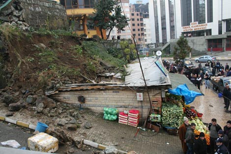 Rize Ticaret ve Sanayi Odası'nın (TSO) çöken bahçe duvarındaki taşların bir bölümü, alt tarafta bulunan iş yerinin üzerine düştü.