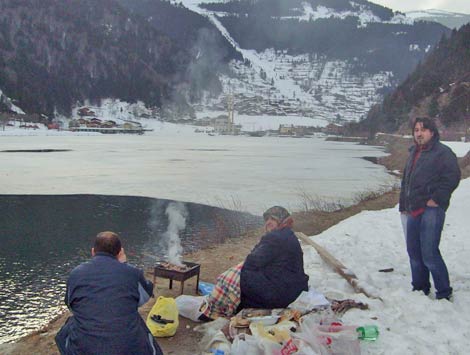 Trabzon'un turistik merkezlerinden Çaykara ilçesine bağlı Uzungöle hafta sonu tatili için çıkan vatandaşlar göl kıyısında mangal yapmanın keyfini yaşadılar.