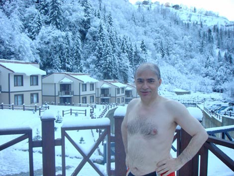 Bayram tatilini fırsat bilerek İkizdere'deki termal tesise gelen ziyaretçiler, kar manzarası ve kaplıca keyfini aynı anda yaşayabiliyor. Rize Valisi Kasım Esen gibi.