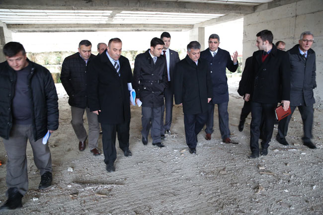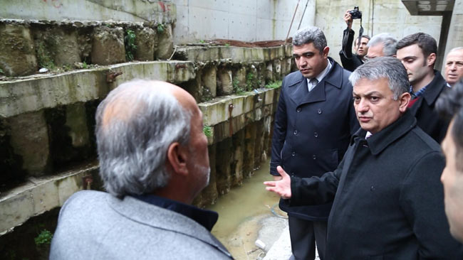 Kaymakam Aslan’ın araya girerek, “Binayı yerinde gezelim” sözü üzerine ise Vali Yazıcı inşaatta incelemelere geçti. Binanın arka kısmının su alması ve biriken suyun akıbeti konusunu soran Vali Yazıcı’ya müteahhit, “Pompa ile suyu çekiyoruz” cevabını verdi. Vali Yazıcı soruna kalıcı bir çözüm getirilmesini istedi.