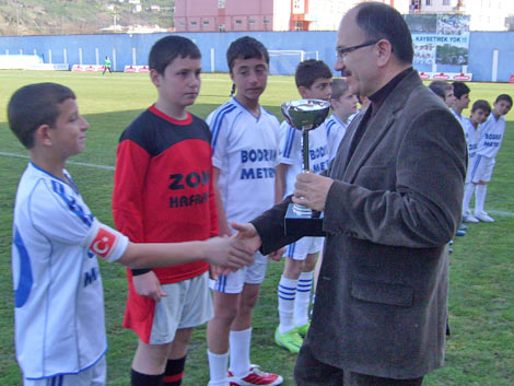 Danone Futbol Turnuvası'nda il birinciliğini elde eden Mesut Yılmaz İlköğretim Okulu takımına Rize Valisi Zekeriya Şarbak kupa verdi.