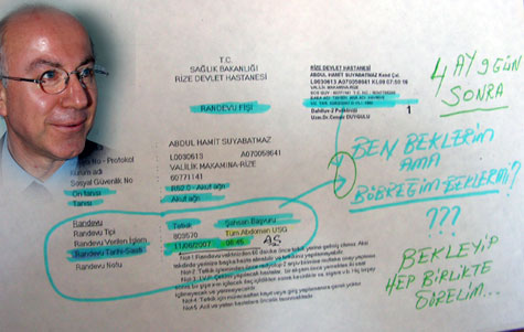 Böbrek ağrısı çeken Suyabatmaz, tedavi için geçtiğimiz gün Rize Devlet Hastanesi'ne gitti. Doktor, Suyabatmaz'dan teşhis için böbreklerine ultrason çektirmesini istedi. Ultrason servisi, istenen filmin çekilebilmesi için Basın Müdürü Suyabatmaz'a 4 ay 9 gün sonraya gün verdi. Yaşadığı ilginç olaydan rahatsız olan Suyabatmaz, hastane tarafından verilen gün kağıdını fotokopiyle büyüterek, üzerine "Ben beklerim ama böbreklerim bekler mi?" yazdı ve tepki olarak yazıyı valilikteki odasının kapısına astı.