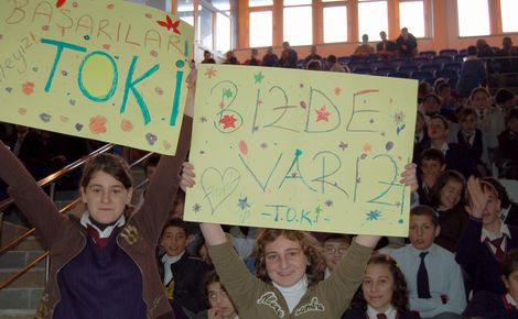 Yarışmada öğrenciler okullarını pankart açarak desteklediler.
