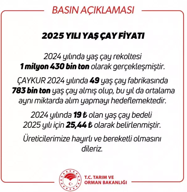 Tarım ve Orman Bakanlığı "2024 yılında 19 TL olan yaş çay bedeli 2025 yılı için 25,44 TL olarak belirlenmiştir" açıklamasında bulundu.