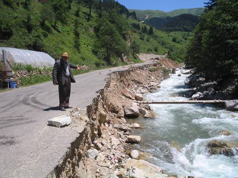 Çamlık Köyünde RİZE-ERZURUM karayolunun 100 metrelik kısmında sel sularının yolun yarısını yıkıp geçtiğini söyleyen Celal ÖTÜRK adlı vatandaş, “Çamlık deresi taşınca burada yolumuzun yarısını aldı gitti. Yol tehlike içinde. Yolun kenarında benim işyerim ve başka evler var.