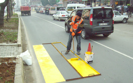 Trotuar yaya geçişlerinin önüne sarı renk çizgiler çekilirken boyama işleminin ardından belediye tarafından otantik görüntüye sahip kemerler eklenecek.