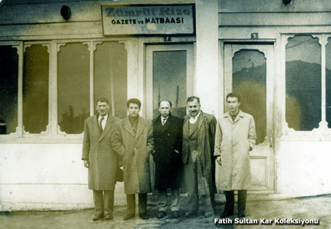 Zümrüt Rize Gazetesi'nin kurucusu Mustafa Ardal ( soldan sağa 4. ) gazetenin Rize'de hizmete başladığı Eski Sümerbank'ın karşısında Kazım Karabekir Caddesinde arkadaşları ile